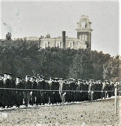 Ya quasi tothom es a dins. Ells y elles s’ han provehit a la entrada de banderetes de panyo, a manera de gallerets, deis colors d’Illinois y de bracals am l’anagrama de la Universitat a que pertanyen. Falten pochs minuts pera ser l’hora. La música toca una marxa popular y després l’himne de la Universitat que es corejat solemnialment pels concurrents.