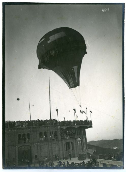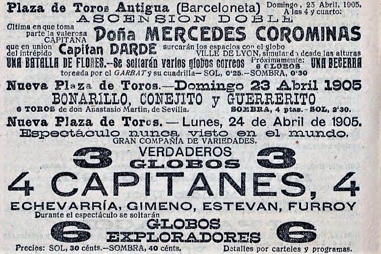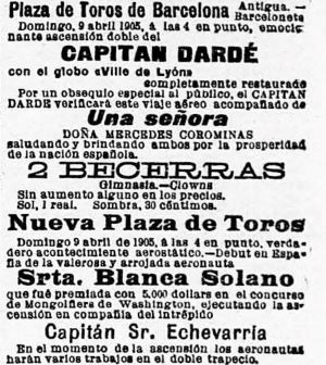 En la plaza de toros de la Barceloneta celebróse ayer un espectáculo cuyo principal atractivo era la elevación en globo de Mercedes Corominas, en compañía del capitán Dardé. Cuando el aeróstato estuvo en condiciones de elevarse sujetáronse ambos aeronautas en dos sillas fuertemente amarradas con listones, y al grito de «suelten todos» empezó el globo á elevarse paulatinamente, y apenas traspuestos los muros de la Plaza descendió en el paseo del Cementerio. Cerca el globo de tierra, deslizóse por una cuerda el capitán Dardé; pero apenas hubo tocado el suelo, elevóse de nuevo el globo, perdido lastre, llevando sola á la aeronauta, la cual sujetóse fuertemente en su asiento, dispuesta á arrostrar el peligro que pudiera caberle en su inesperada ascensión.