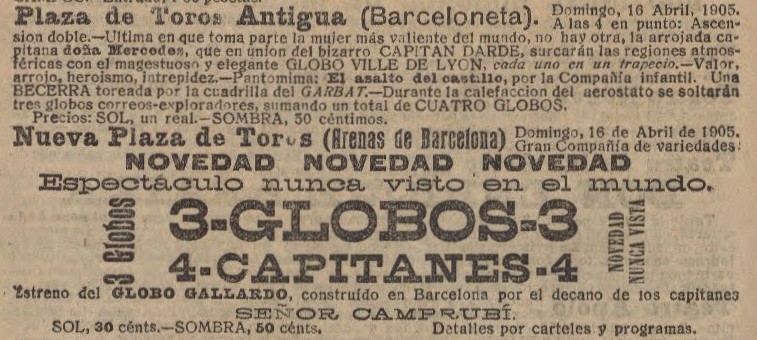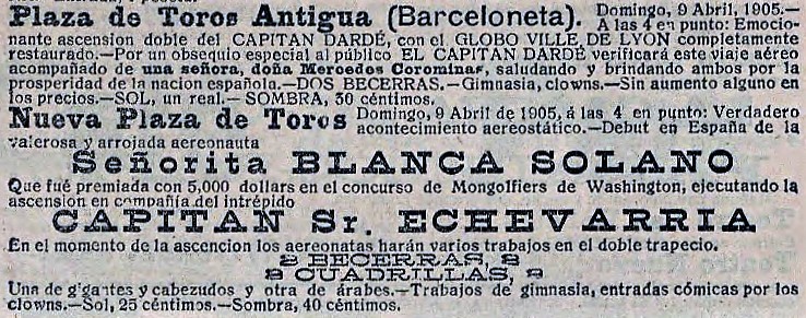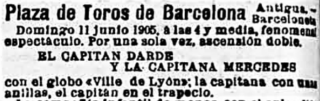 Els empresaris de les places havien trobat un filó, i es van posar a treure’n profit. Es nota en l’escala creixent dels anuncis en premsa, que augmenten de tamany: “Domingo, 16 de abril, 1905. A las 4 en punto: Ascensión doble – Última en que toma parte la mujer más Valiente del mundo, no hay otra, la arrojada capitana dona Mercedes, que en unión del bizarro Capitán Dardé, surcarán las regiones atmosféricas con el magestuoso y elegante globo Ville de Lyon, cada uno en un trapecio. – Valor, Arrojo, heroísmo, intrepidez.”. A la pàgina 15: “El bello sexo se nos sube á las barbas. La capitana de los aires doña Mercedes va á demostrarnos que eso de elevarse en globo es algo tan fácil como hacer calceta. Doña Mercedes y el capitán Dardé surcarán los aires en el globo Ville de Lyon, partiendo de la Antigua plaza de toros de la Barceloneta, mañana por la tarde. Capitana y capitán ocuparan su trapecio respectivo, naturalmente.” 15/04/1905 El Diluvio). La Nueva Plaza triplica l’aposta. Enlloc d’un, tres globus: