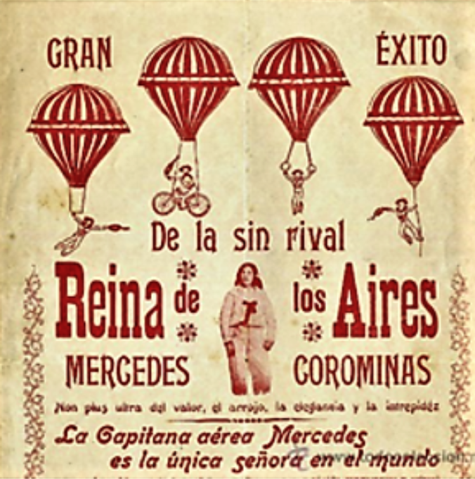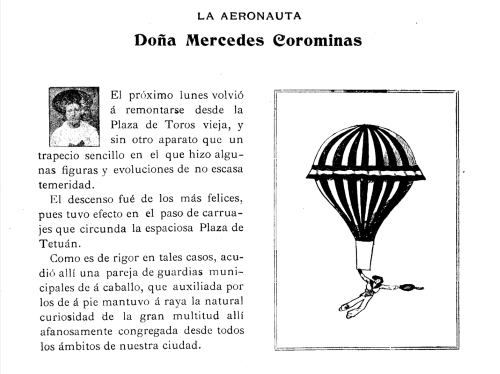 La intrèpida aereonáuta Dª Mercedes Corominas. Ha sido alumna de los gimnasios Bricall y Colón. Hoy asiste á las clases del Gimnasio  Santanach. Actúa con mucha frecuencia en espectáculos de gimnasia, de aereostación y hasta taurinos. Se ha propuesto crearse una posición independiente y está próxima á conseguirlo. Debido á su presencia de ánimo y á su arrojo, nombradía no le falta; lo cual la coloca a lado de otras muchas mujeres (que aun siendo la excepción) han sobresalido en todo tiempo, demostrando que el llamado sexo débil, lo mismo en ejercicios de fuerza y resistencia que en las más arriesgadas pruebas de coraje y de valor, puede llegar á valer tanto come el sexo fuerte.” (02/09/1905 Los Deportes, p. 7).