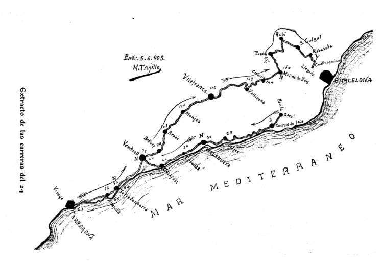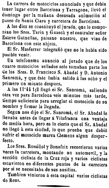 Barcelona. 24 d’abril, dilluns de Pasqua. Es corre una cursa important, organitzada per l’Sportmen’s Club. Dificultats en l’itinerari inicial determinen finalment Gavà com a punt de sortida d’una corrida de motocicletas, mentre que el viratge es fixa a Tarragona. Potser l’oferiment d’un premi de 125 ptes. del Club Velocipedista de Guillem Tarin pel qui corri més.els va fer canviar d’opinió…