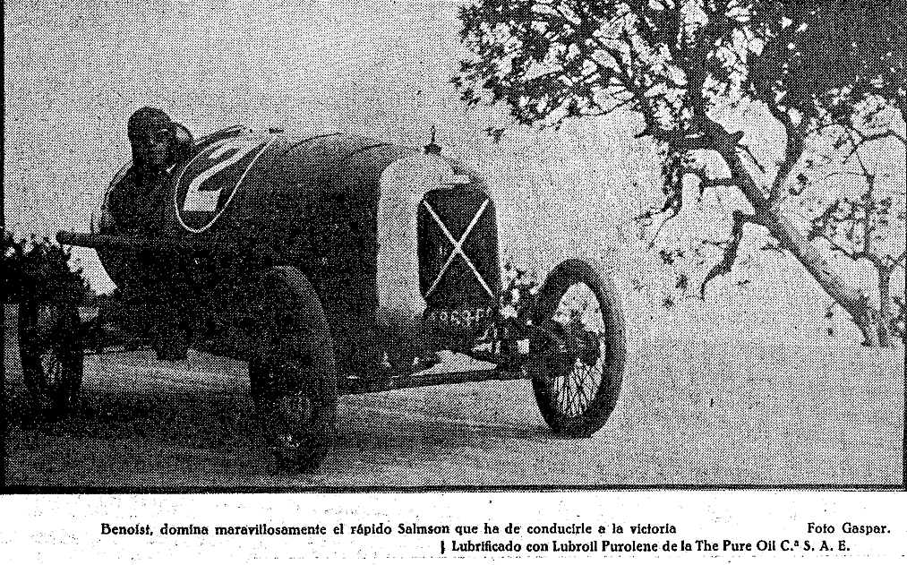 “Benoist vainqueur a Barcelone. Le grand prix des cyclocars disputé sur le circuit de Tarragone, en présence d’un public nombreux, s’est terminé par la victoire de Benoist, pilotant une voiture française. Le vainqueur couvert les 363 kil. 400 du parcours en 4 h. 18″ 5/10, soit à une vitesse horaire de 83 kilomètres. Frédéric Armangue s’est classé second en 4 h. 45″ 9/10; le comte Sert, troisième en 4 h. 35′ 54″.” (31/10/1922. Excelsior).