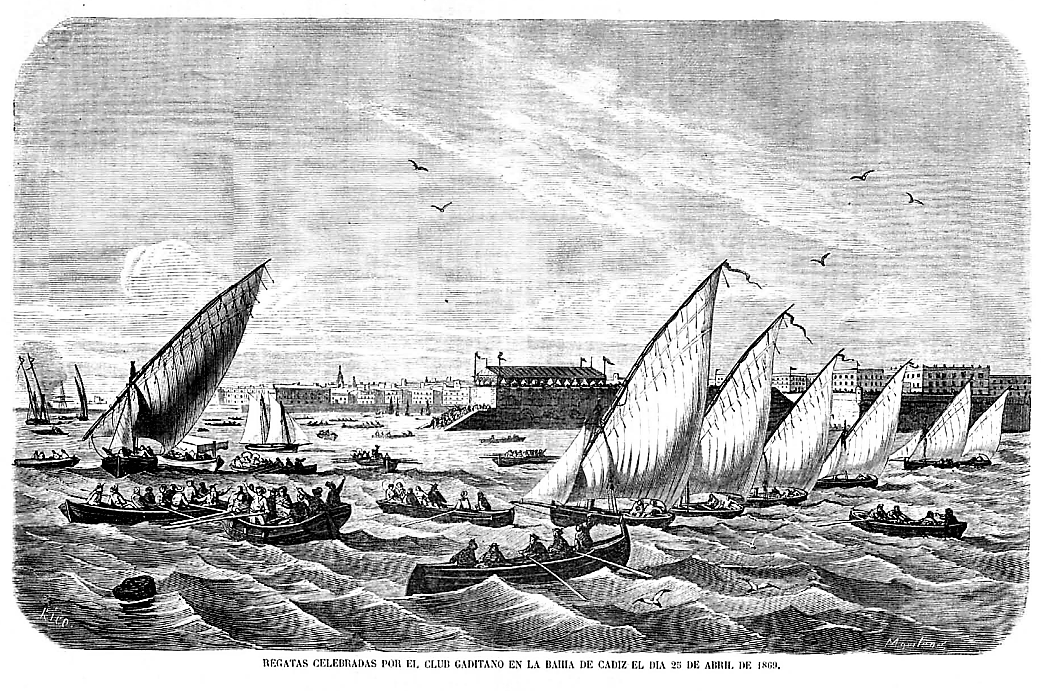 De les regates realitzades a Cadiz el 23 d’abril de 1869 tenim aquesta il·lustració, de les escassíssimes imatges existents d’aquesta especialitat esportiva: