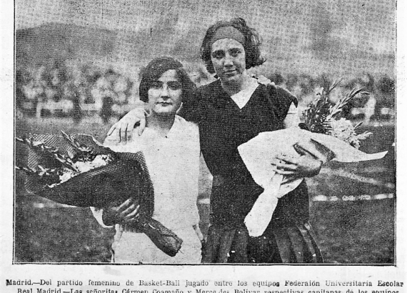 11/12/1928 El Sol, p. 3 “BALONCESTO. La primera exhibición en Madrid. Resultó interesantísimo el festival organizado el domingo en el Estadio Metropolitano por el Athlétic Club y la Federación Universitaria Escolar. Asistió mucho público, a pesar de lo desapacible de la mañana. A las once, y bajo las órdenes de D. Joaquín Infante, salieron al campo los equipos femeninos do baloncesto (“basket-ball”), formando como sigue: Federación Universitaria Escolar.—Señoritas Carmen Caamaño (capitana), Carmen Corriols, Pepita Callao, Pilar Villalba y Adelaida Muñoz. Real Madrid.—Señoritas Mercedes Bolívar (cap.), María de las Nieves González, Ramona Crespo, Cristina Mariné y Odette Rousell.