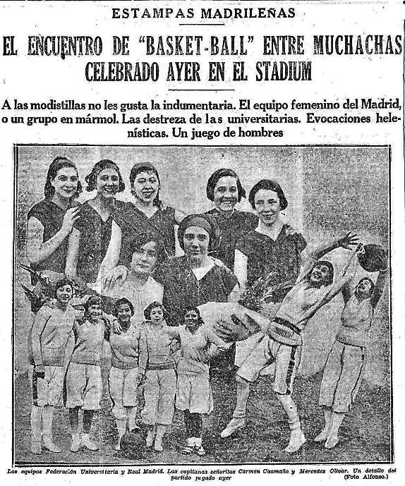 10/12/1928 La Voz, p. 3 “El encuentro de “Basket-ball” entre muchachas celebrado ayer en el Stadium. A las modistillas no les gusta la indumentaria. El equipo femenino del Madrid, o un grupo en mármol. Las destreza de las universitarias. Evocaciones helenísticas. Un juego de Hombres. Reconozco que a los profesionales, a los técnicos, y aun a los buenos aficionados deportivos, esta ligera impresión acerca de un partido de “basket-ball” por lindas muchachas les parecerá algo anacrónico, desplazado, sin justificación. El deporte femenino es antiguo. Puede que tengan razón. Pero por eso se inserta en otra página del periódico, sin el aire de una crónica de deportes, sin crítica ni alusiones técnicas…