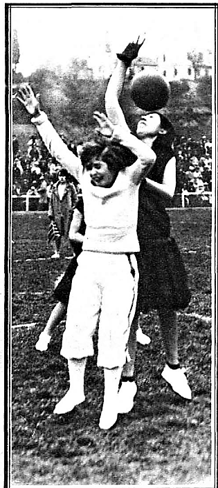 En tanto el pueblo, situado en la gradería, exteriorizaba su entusiasmo y animaba a las vencedoras, acogiendo con júbilo y aplausos cada uno de los “goals”. A una caída violenta, brazos y piernas por el aire—la indumentaria, discreta, apropiada, hurtaba el mal pensamiento—, seguía un avance y una reacción desesperados. Las melenas al aire embellecían las figuras.