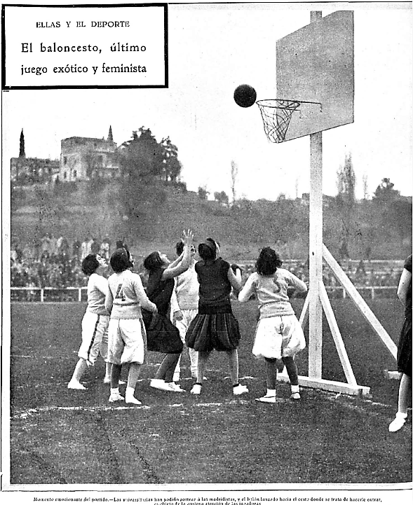 10/12/1928 La Nación, p. 1 “El baloncesto es un deporte airoso y bello, sobre todo practicado por mujeres. No tiene las actitudes agobiadas del “hockey” ni los gestos violentos y trágicos del balompié. El baloncesto tiene algo de danza rítmica, obliga a un constante erguimiento; los brazos y la cabeza, perennemente elevados al cielo, en actitud clásica, como de ofrenda. Ayer se ha celebrado, por primera vez en Madrid, un partido público de este deporte, entre los equipos femeninos del Madrid y de la Federación Universitaria.”