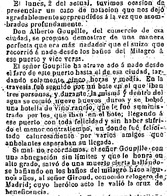 El joven suizo don William Tarín de 20 años de edad, del Comercio de esta plaza, concertó una apuesta consistente, en un banquete para varios de sus amigos, contra dos franceses de este comercio, á que iría y volvería nadando desde los baños del Milagro hasta la embocadura de nuestro puerto y viceversa. A dicha hora tuvo lugar el citado ejercicio de natación seguido por un bote, llegando al puerto sin fatiga de ningún género, donde se detuvo una media hora regresando al punto de partida, arribando algo cansado particularmente de las piernas, y ganando como es consiguiente dicha apuesta. El trayecto recorrido por el nadador fue de unos 8 kilómetros tardando en su travesía unas cuatro horas; y al llegar á tierra, fue objeto de una verdadera ovación por la inmensa concurrencia que asistió á presenciar la apuesta.