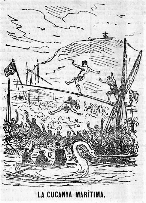 La cucaña marítima divirtió grandemente a los espectadores, pues hubo muchas zambullidas, durando cerca de una hora, por haber muchos aficionados a ella, sin embargo del baño que tomaban al caer desde la verga en cuyo estremo se habia colocado la bandera. Uno, no obstante, hubo que si bien no llegó al estremo, consiguió coger la bandera, que arrancó consigo al caer en el mar. Este fué el premiado.